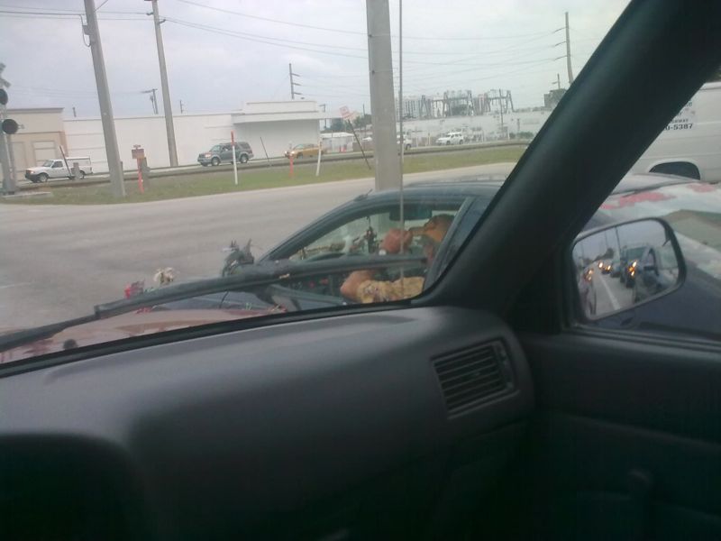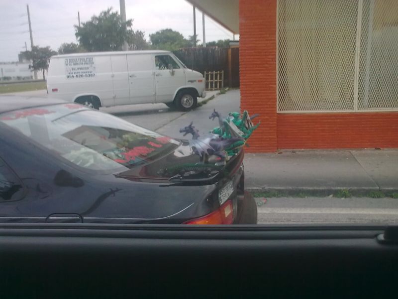 as i was heading out of florida i pulled up next to a guy with a car festooned with dragons, both inside and out. didn’t have ready access to my camera so i had to use the cell phone instead. somehow i think the pics are better because they are worse.