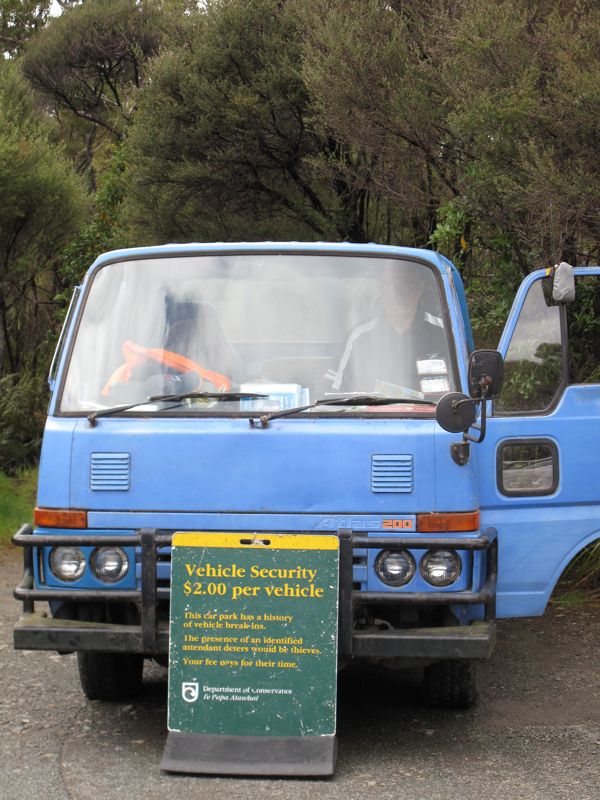 NZ crime rate is very very low, especially violent crime. however, they have had a huge problem with petty theft in many of the parks. so you'll sometimes find these guys parked at the head of a trail. and for $2 they will watch your car or bike.