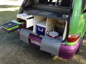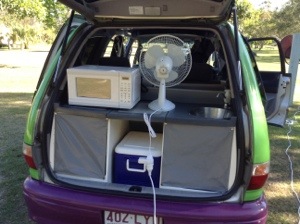 Pics below: The Pantry, The Bed, The Kitchen, stopped at Kmart (big here in AU) and bought a fan for hot evenings, a microwave to cook dinners, and an extension cord, all for $65—should more than pay for itself versus dining out, last pic is my homemade bug screens.