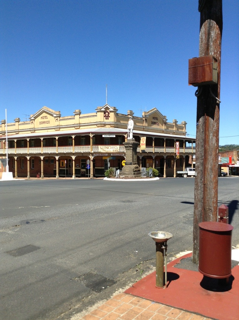 Main square Dorrigo, New South Wales. Common sites: a prominent hotel from the turn of last century (usually with a pub on the ground floor and often times a decent place to grab lunch at a reasonable price); the monument to those killed during WW 1; and, interestingly, a public water fountain on the corner.