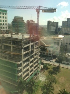 I’m watching as they construct a building across the street from my hotel—they dumped a load of concrete from the 9th floor last night. Fortunately it landed on a vacant lot. But, I’ve altered my walking route as a precaution. Now all I have to worry about is whether or not the tower crane they’re using would strike my room should it collapse….
