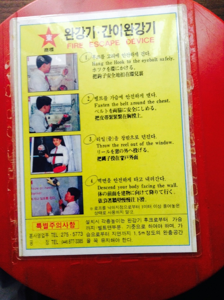 I’ve been mostly staying at airbnb places rather than hotels. But the past couple days have been at a hotel. Found these items I’ve never seen in a hotel before. A smoke hood for escaping a fire. And, really odd, a descender for rappelling out the window in the event of no fire escape access. Even a bolt by the window to clip onto. I’m on the 8th floor, so that would be a nearly 100′ rappel. Don’t know if this is common thing in Korea or not.