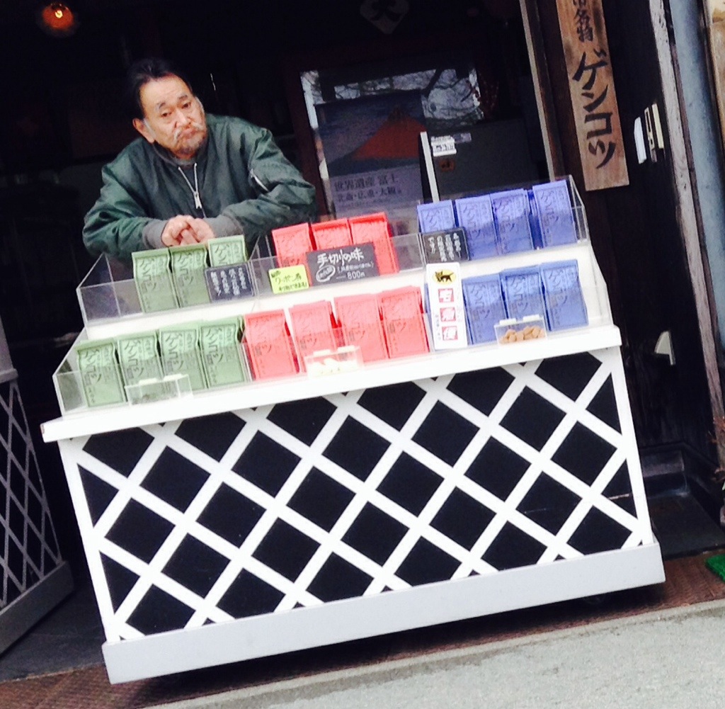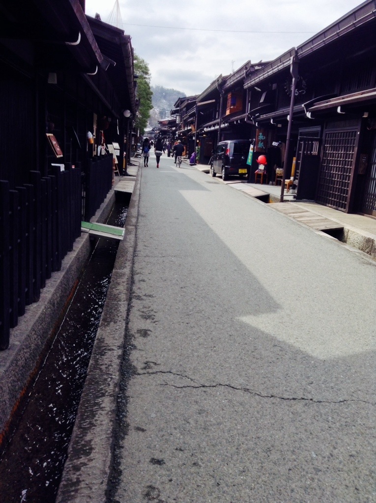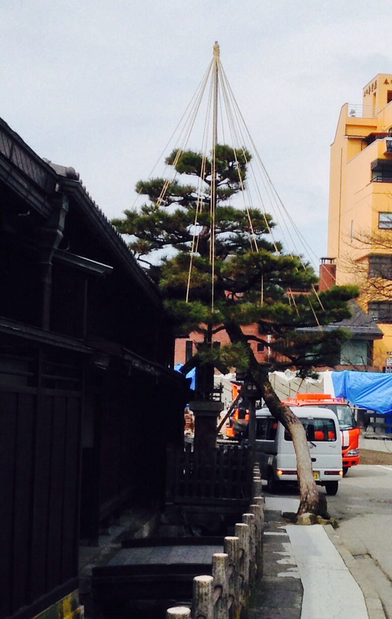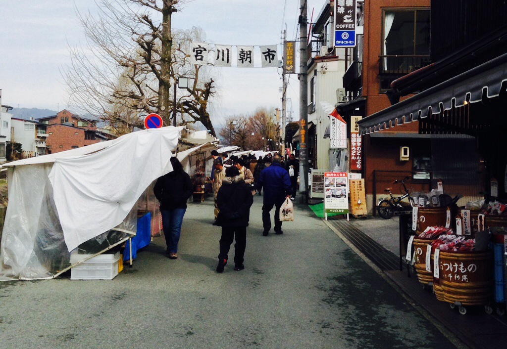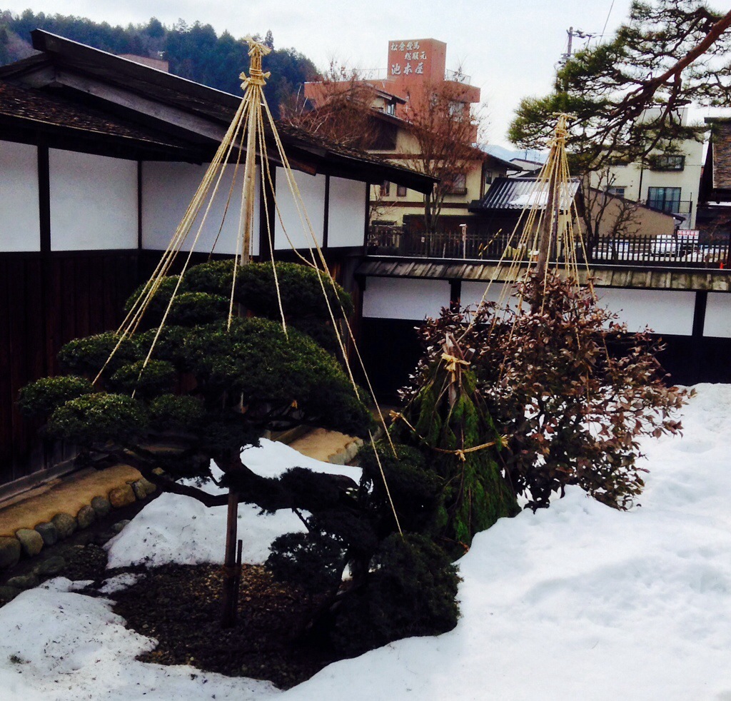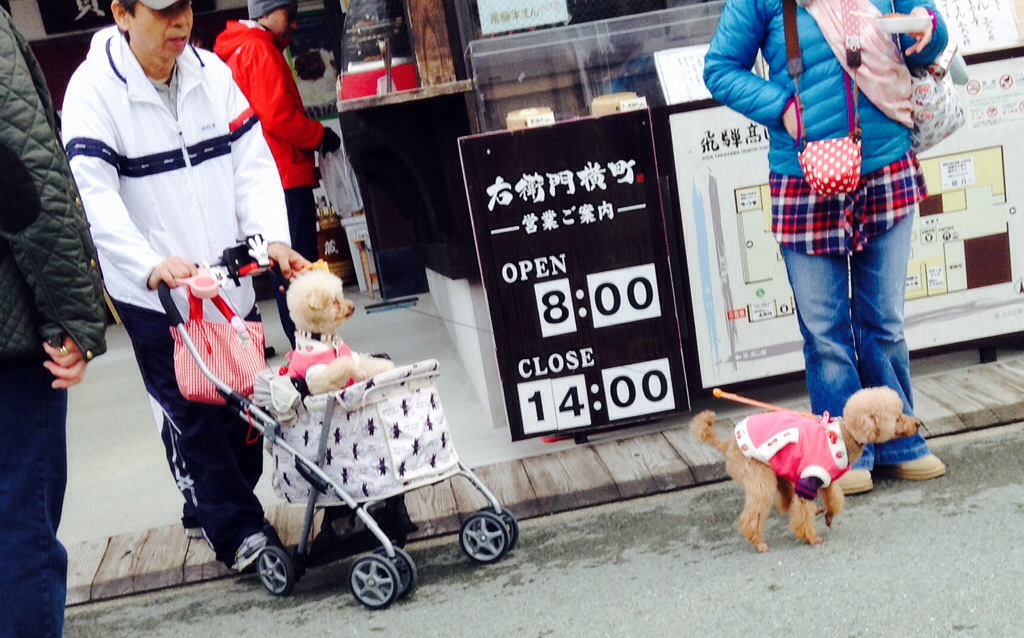 Some Takayama street scenes. The trees/bushes with ropes growing out of them are being protected from snow loads. Having a large plank of wood serve as a sign is, I’m guessing, the tradition. We regard to the poodles, not sure how they decides who walks and who rides.