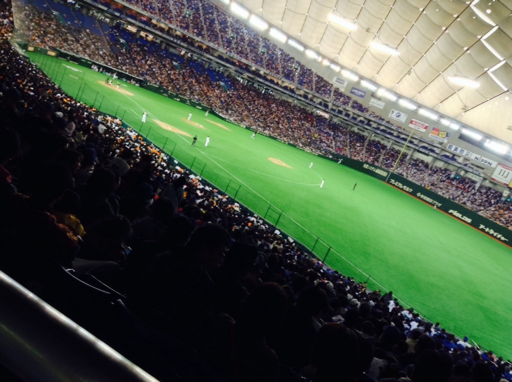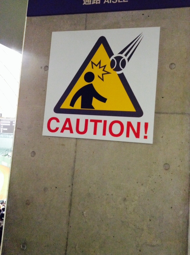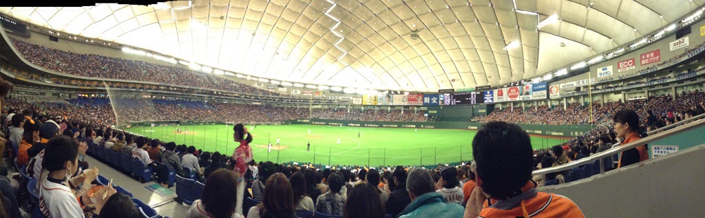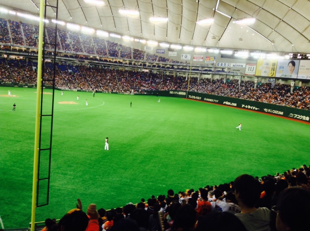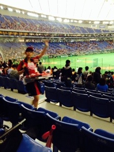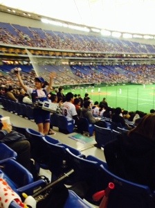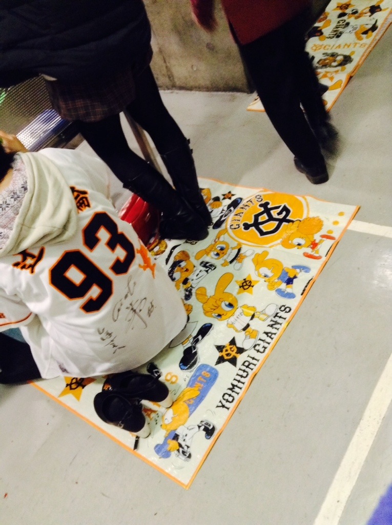 Attended a Japanese preseason baseball game between the Giants and the Fighters. Fighters over the Giants 3 to 3 in 2 hours and 53 minutes. A very well played game. I sat in reserved seating for the first six innings then wandered about for the last three. Ended up by the bleacher bums—definitely the best place to sit to get the true ambiance of a Japanese ball game. Another advantage to the bleachers is the lack of armrests on the seats. The regular seats are at least an inch narrower than a US seat. Some notes: