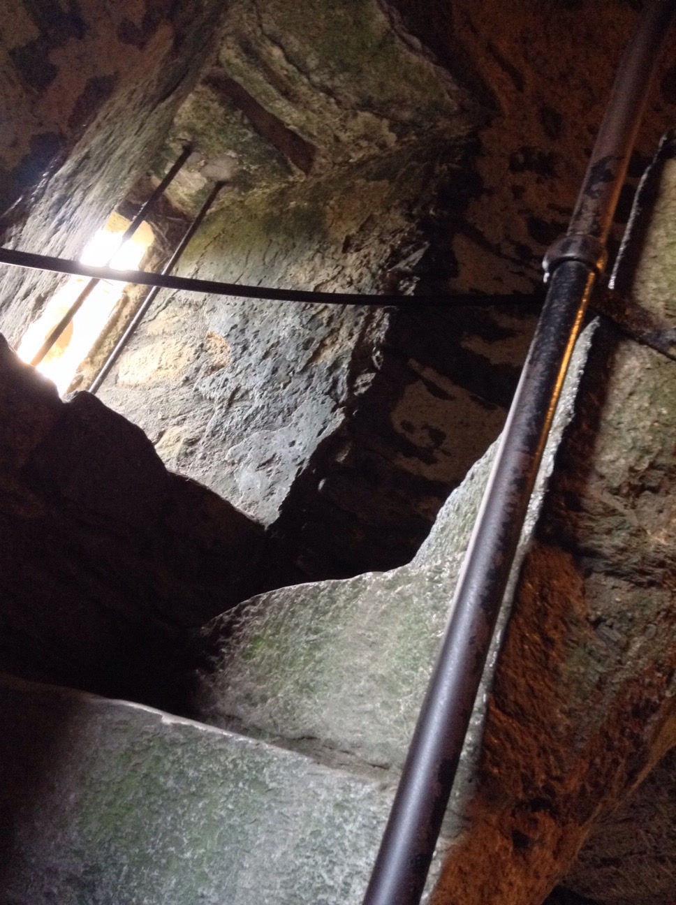 The spiral stairs all tend to be a right-handed twist. A defensive matter, as most folks are right-handed it gives the “uphill” person with a sword or other weapon the advantage.