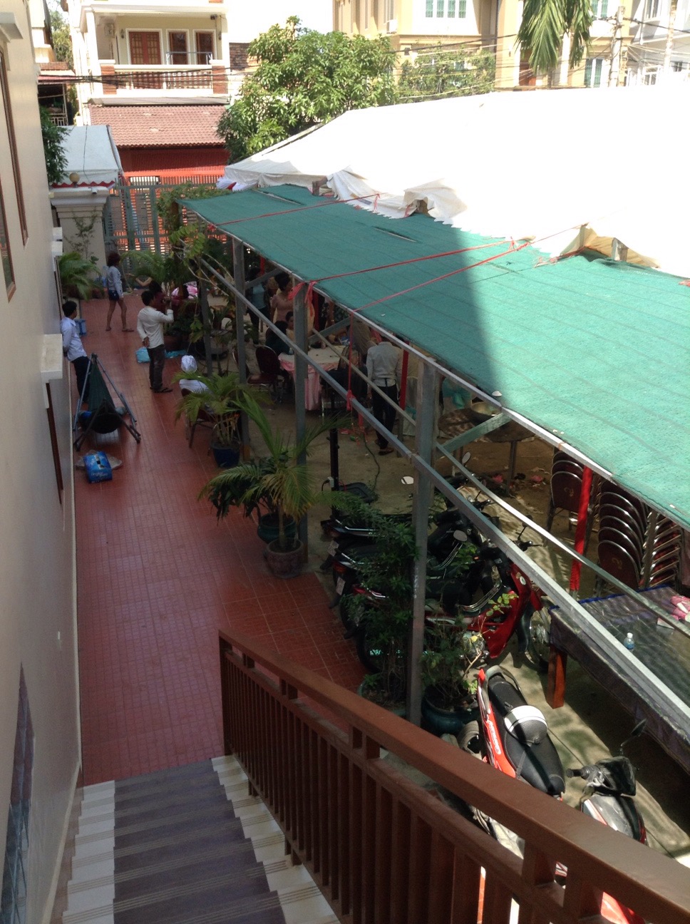Alas…there’s a party going on! I’m not sure what the occasion is. It could be a wedding, or maybe it’s an anniversary, or maybe a birthday, or? I’m hoping it’s not a wedding as those last 3 days. In any event, my building is surrounded by tents. One is a dance floor, another is a seating area, and there’s the kitchen tent. They have a band! Which is fine except the music is Cambodian, not in my iTunes library. Which is fine, except it’s really really loud. Which is fine, except they have the bass way too loud. Which is fine, except they have tag-team singers, so the music never stops. OK, none of it’s really fine.