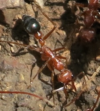 Bulldog Ant, that is. Also known as Inch Ants. There are 93 species of this critter in OZ. They range in size from .5″ to 1.5″. These are one of the less giant species, about .75″. They have a nasty sting, a bit worse than a bee sting. They inject venom that some folks are allergic to and from which some have died. They are an ancient ant. They have the second largest eyes of all ants and as a consequence, can see you and react to you. Unlike most ants they are solitary hunters.