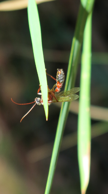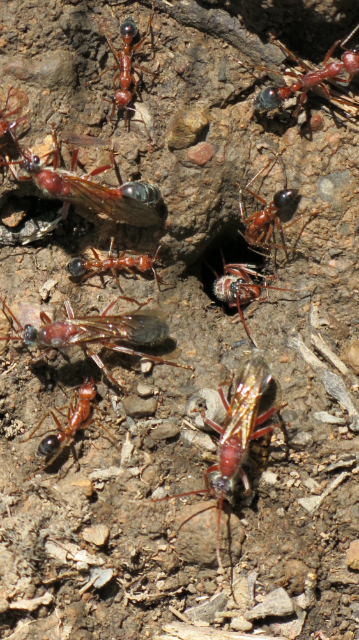 I came across this nest where the males and(?) queens were crawling out of the hole, climbing nearby vegetation and flying off to start new colonies.