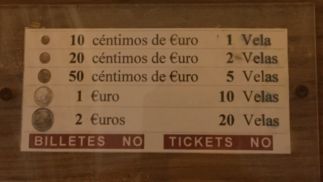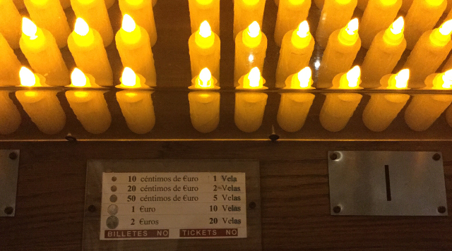 Some church that has electric prayer “candles.” The best part? Some light bulbs (“candles”) cost .10 euro, some cost 1 euro. Only the cheap-ass prayers are pictured herein.