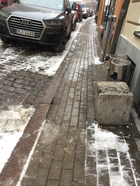 Fun feature of many Riga sidewalks, they are sloped. Made even more fun by snow and ice. Why? No idea.