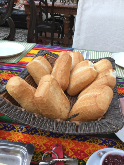 Consists of juice/coffee/tea, a plate of cheese and ham, eggs of either the scrambled/fried/hard boiled variety, a slice of some melon, and, best of all, this bread—incredibly light on the inside and crusty on the outside. I can only compare them to a really really good French baguette.