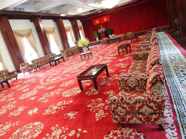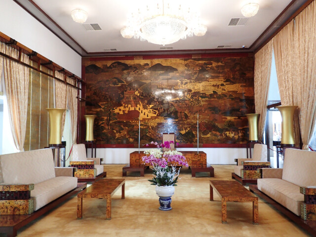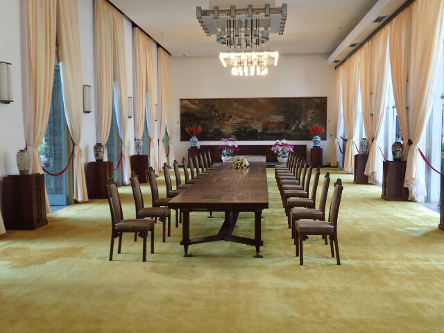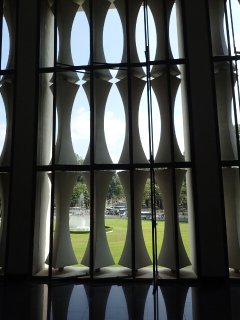 One neat architectural feature is that the building is surrounded by these floor to ceiling windows that rotate open to allow airflow. Window jams in this photo are the straight vertical lines, windows open:
