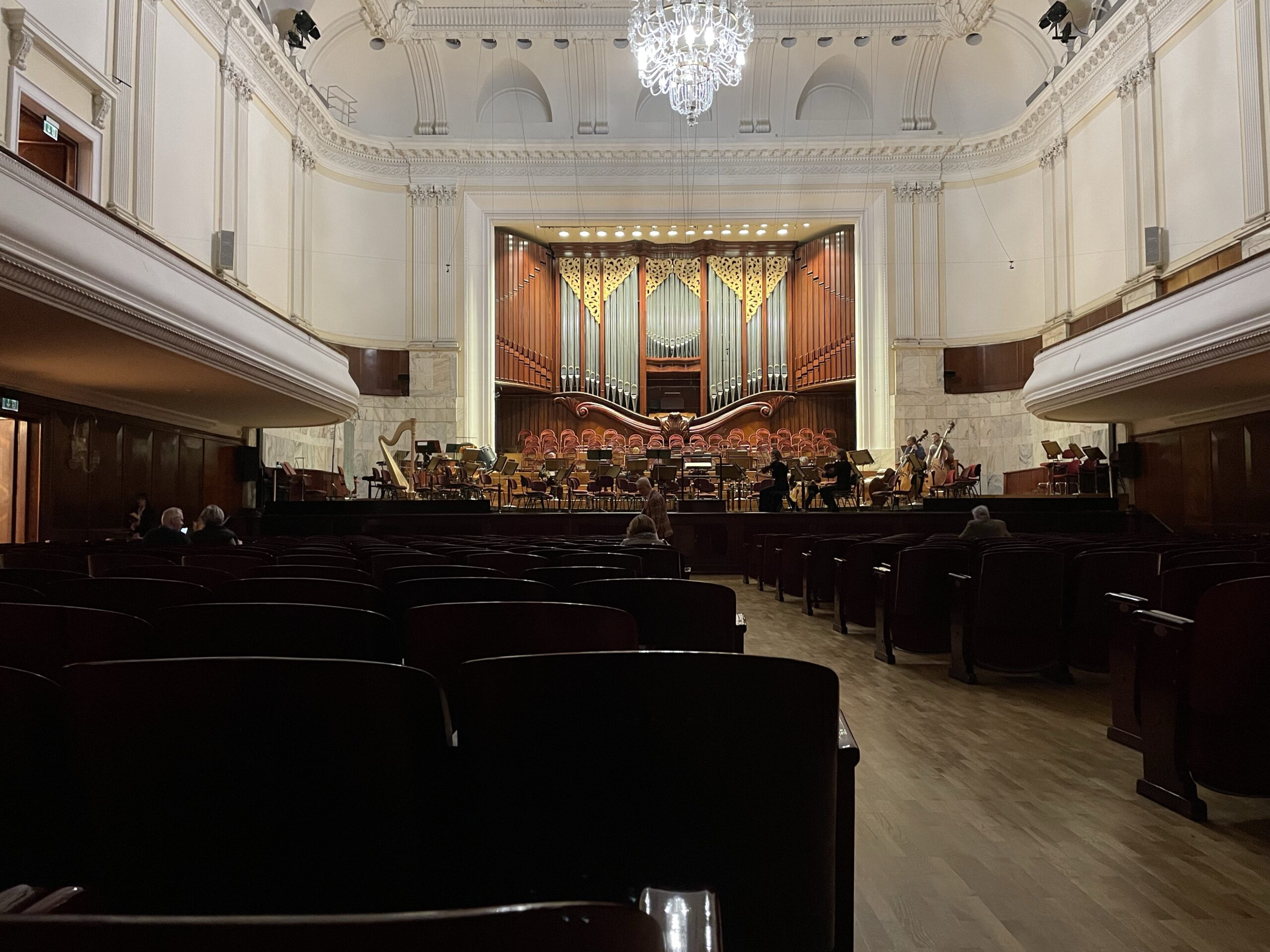 Old time concert hall. Solid wooden seats, rosewood maybe? Rows designated by Roman numerals — some confused patrons.