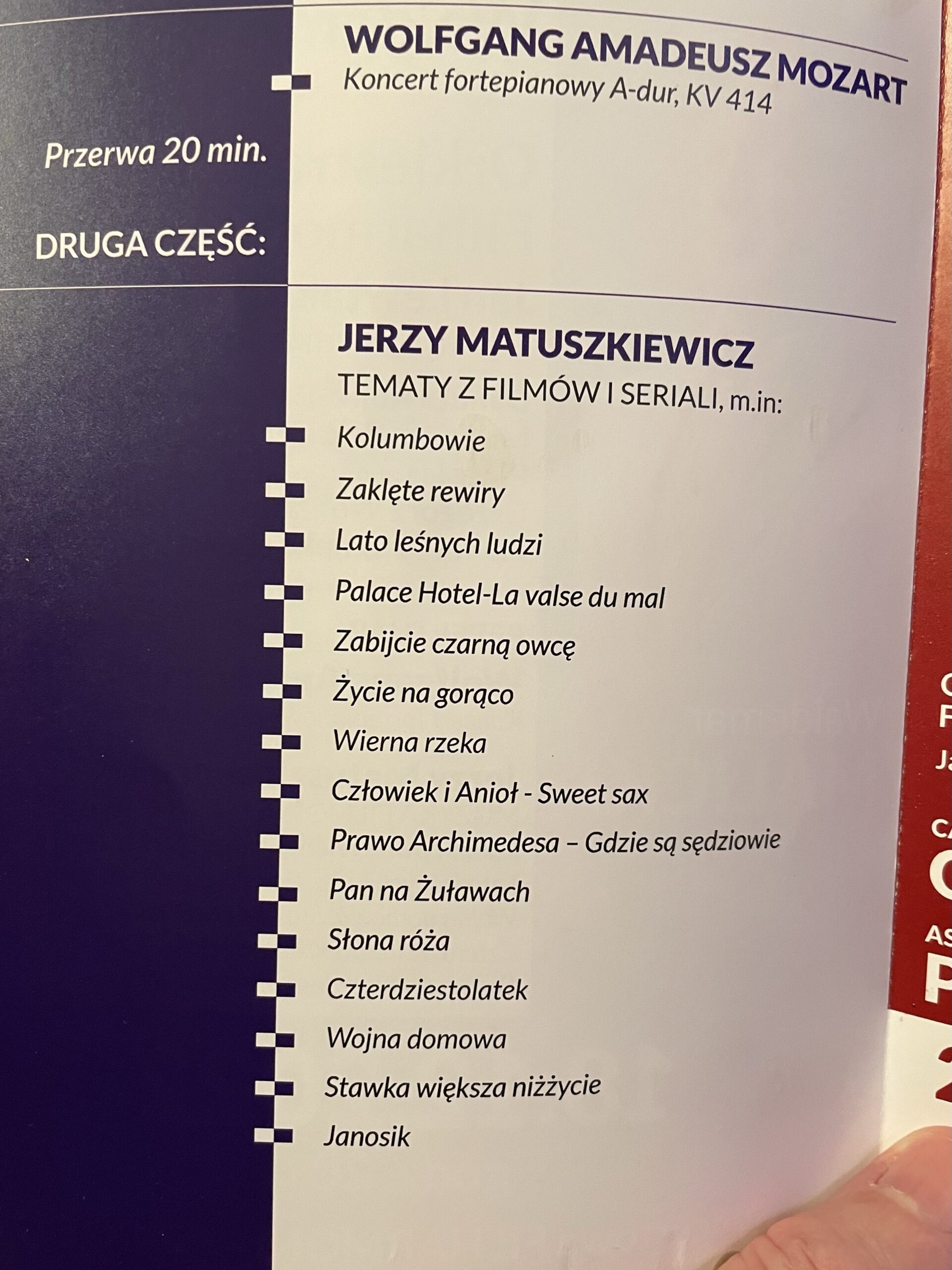Mozart kv. 414 was the premiere piece. Followed by about 15 little mostly forgettable blurbs from movie soundtracks by some Polish composer. One was interesting, the rest were poor elevator music.