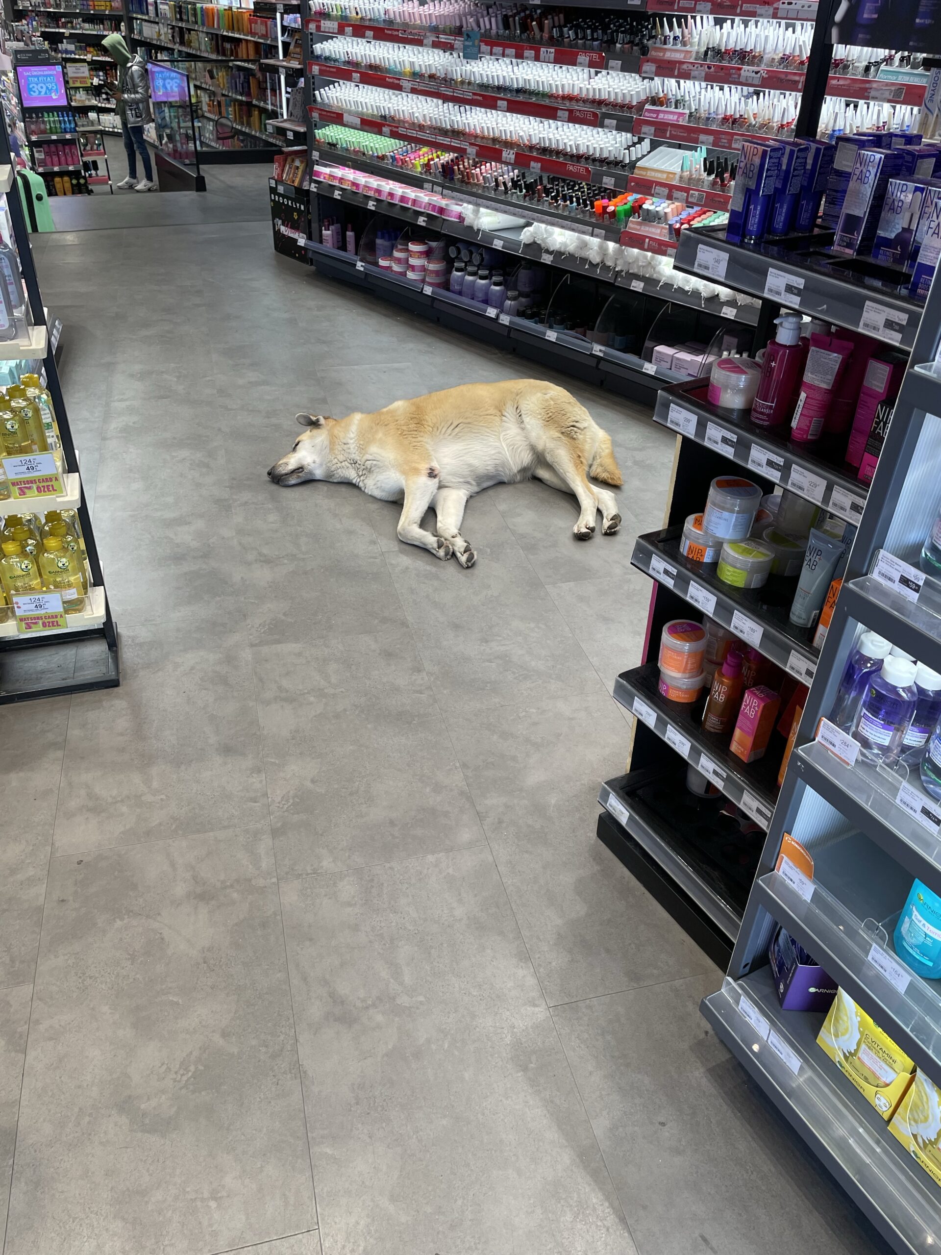 There’s a Watsons in Taksim Square. Two of the Square’s mutts like to hang out in it when it’s at all chilly outside. Everyone, employees/patrons, just ignores them and the dogs mostly sleep.