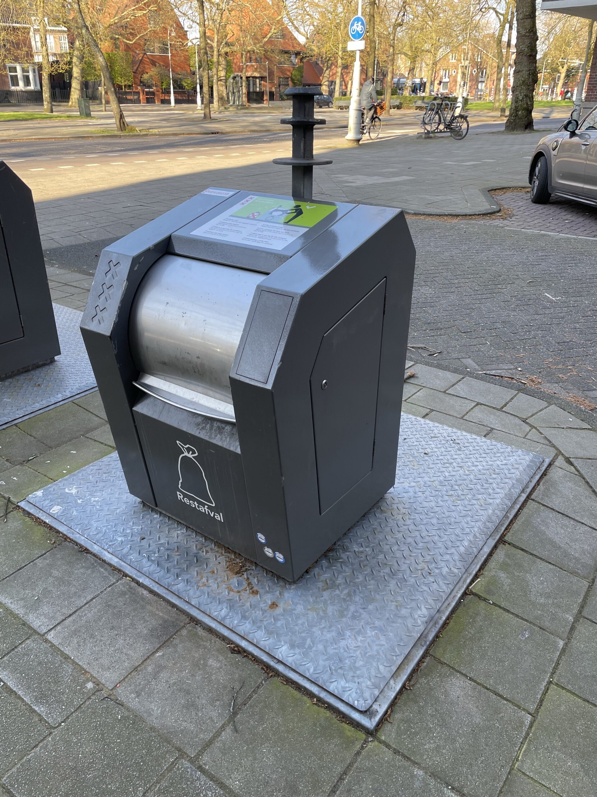 Now this is interesting. A neighborhood garbage bin. Only the little brown part is above ground. The huge grey box below the brown part is below ground. They come around with the truck and pull the whole she-bang up and the bottom of the grey box opens and they dump the contents into the garbage truck and then slide the grey box back into the ground.